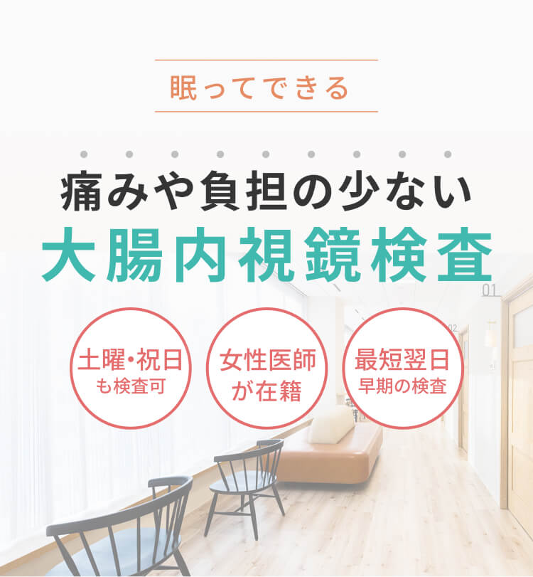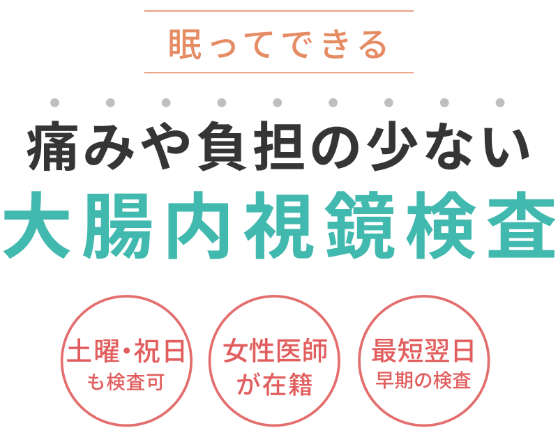 眠ってできる 痛みや負担の少ない大腸内視鏡検査 土曜・祝日も検査可能,女性医師が在籍,最短翌日早期の検査