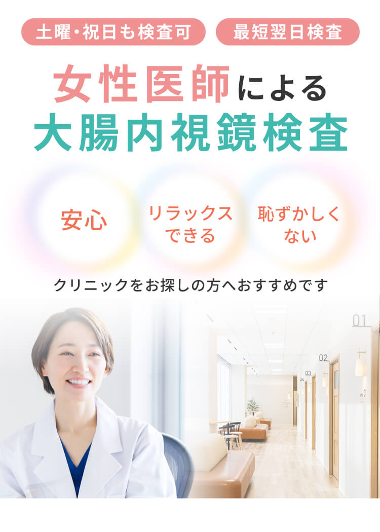 女性医師による大腸内視鏡検査 土曜・祝日も検査可能,最短翌日検査 安心,リラックスできる,恥ずかしくない クリニックをお探しの方へおすすめです