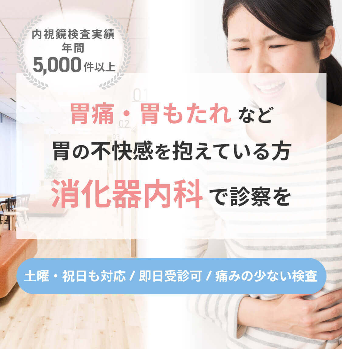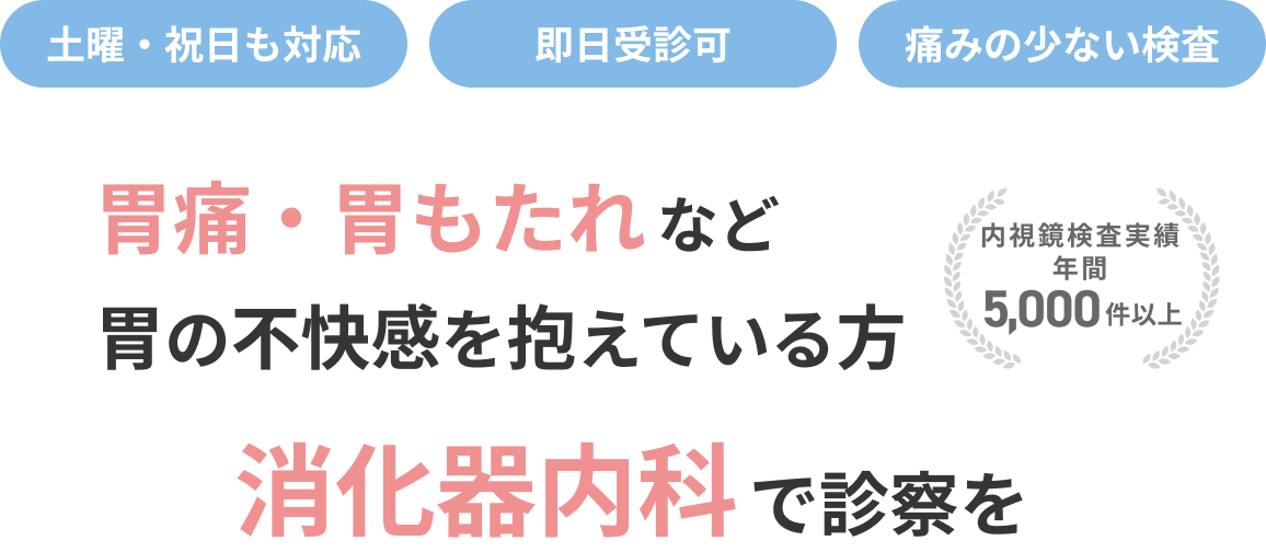 胃痛、胃もたれなど胃の不快感を抱えている方 消化器内科で診察を 土曜・祝日も対応/即日受診可/痛みの少ない検査