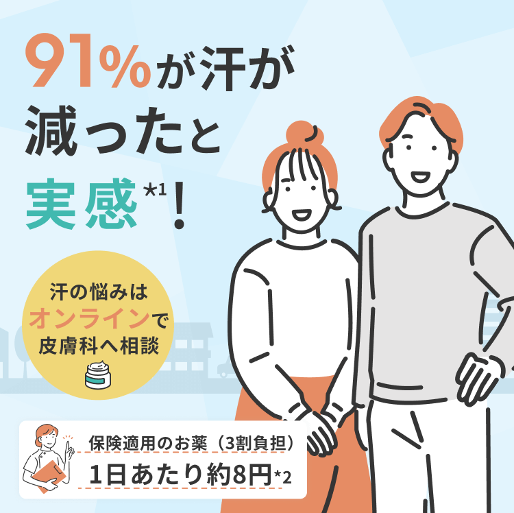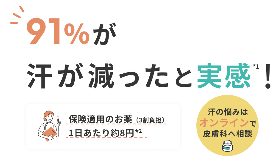 ※1 2024年5月実施:当院の多汗症オンライン診療を受診された患者様へのアンケートで、お薬の使用で効果を感じた217名の患者様の回答より