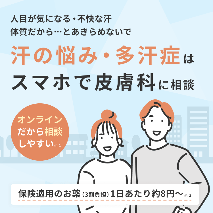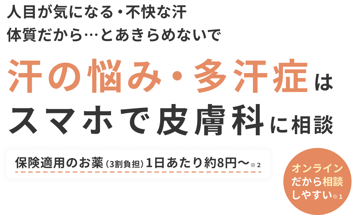 多汗症の治療は保険適用のため、3割負担で受けられます。当院で受診される場合は、オンライン診療となります。