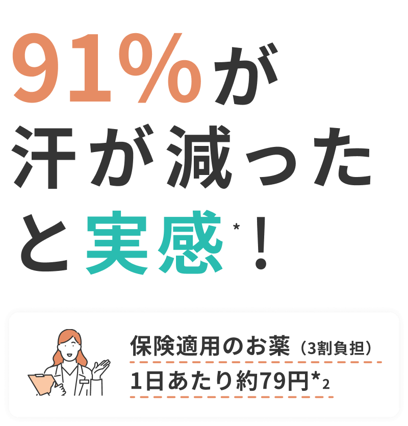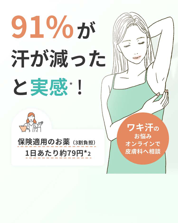 91%が汗が減ったと実感※ ワキ汗の悩みオンラインで皮膚科へ相談! 保険適用のお薬(3割負担)1日あたり約79円 *2